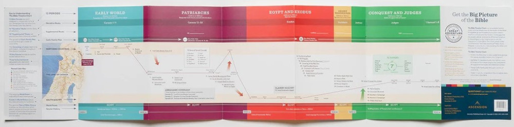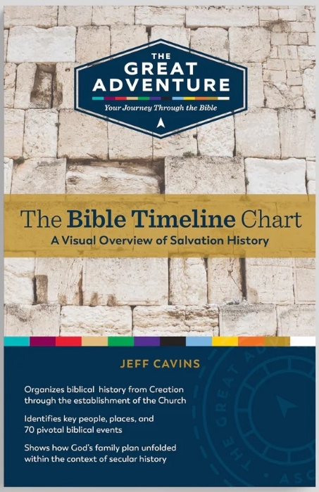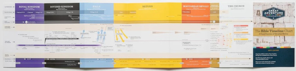 This color-coded Bible study tool shows how all of the books of the Bible fit together to tell the story of salvation history. It arranges the key people, places, and events of Sacred Scripture in chronological order, so that you can get the big picture of the Bible. This Chart is the cornerstone of The Great Adventure Catholic Bible Study Program.