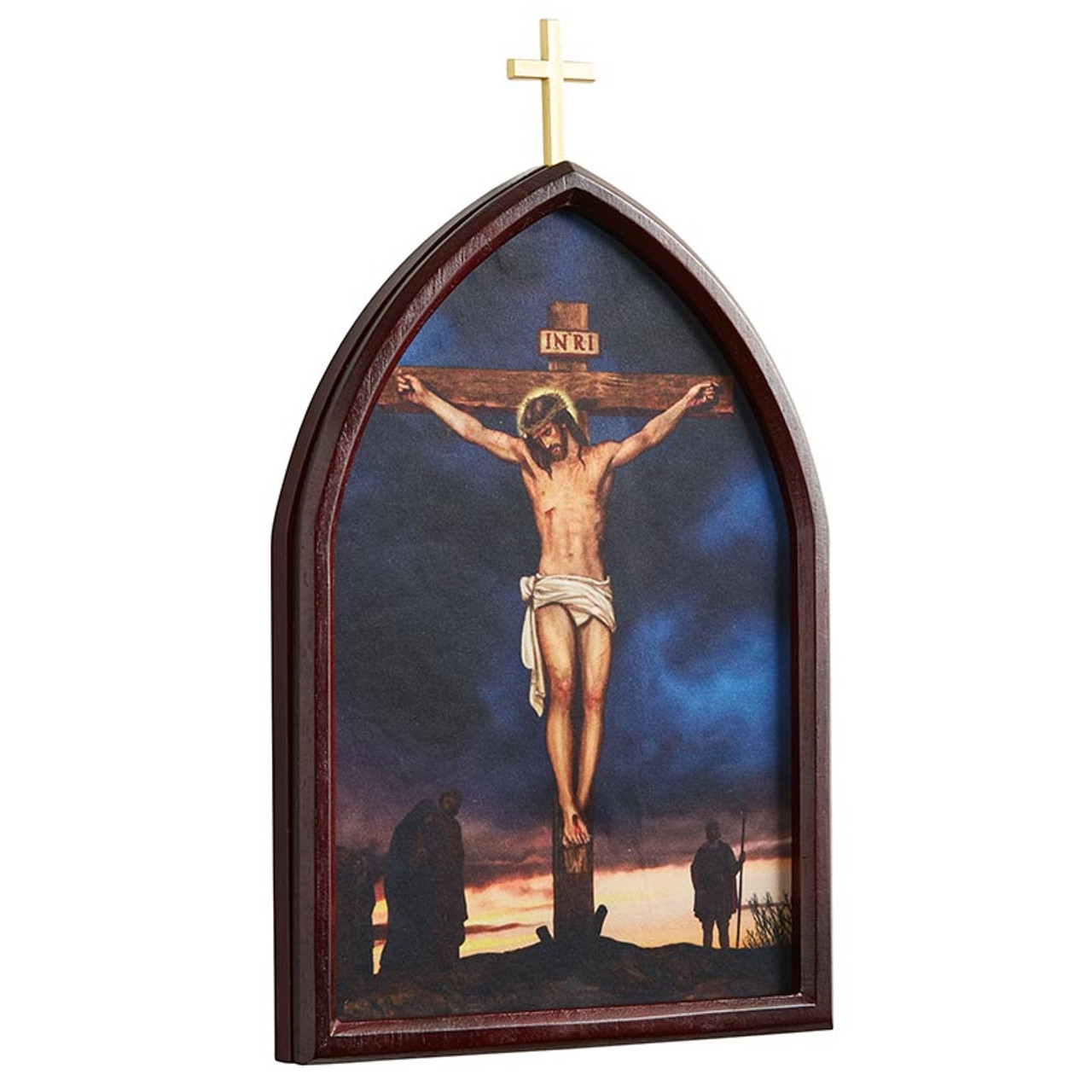 These lovely images are printed with a dye-sublimation process on a satin polyester fabric reflecting a velveteen appearance. The arch frame is made from birch wood finished with a cross top. Each plaque wonderfully depicts one of the 14 Stations of The Cross. A notch has been added to the back for easy hanging. Please allow 4 to 6 weeks for delivery. A perfect size for your chapel, school, or home.