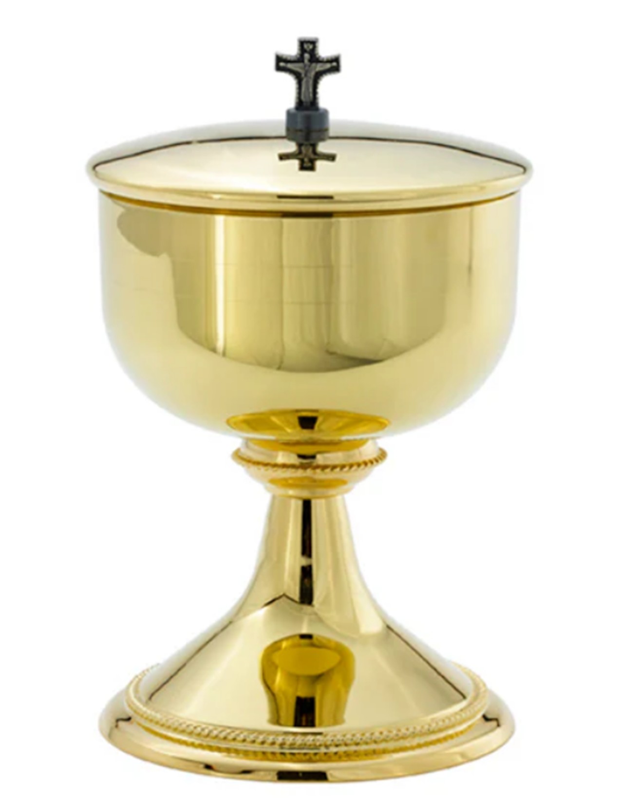 Simple and classic 24kt gold plated Chalice and Bowl Paten. The Chalice is 6 1/2" in height and can hold 14 oz. The bowl paten is 6 1/8" in diameter. Chalice and paten only; ciborium sold separately (B-491G) .