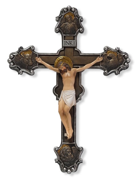 The icons adorning this crucifix represent the winged "living creatures" associated with the Four Evangelists: St. Matthew, the Man; St. Mark, the Lion: St. Luke, the Ox; and St. John, the Eagle. These portrayals have often appeared in religious art and architecture. Measures 10.25" (H) x 7.5" (W) x 1" (D). Resin stone mix.
