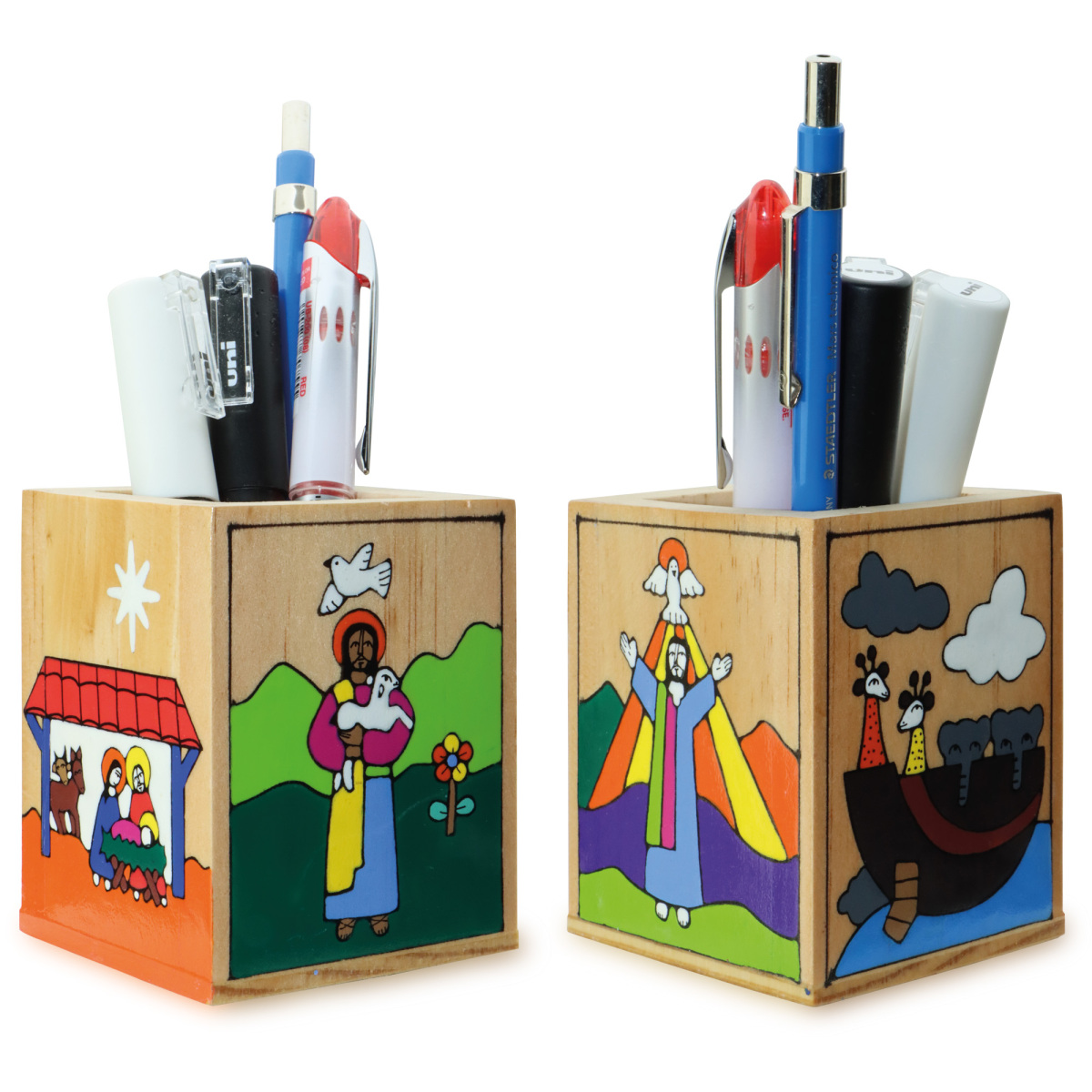 Wooden pen holder, with coloured images: Christmas, Easter (Risen Christ), Shepherd, and Noah's Ark.