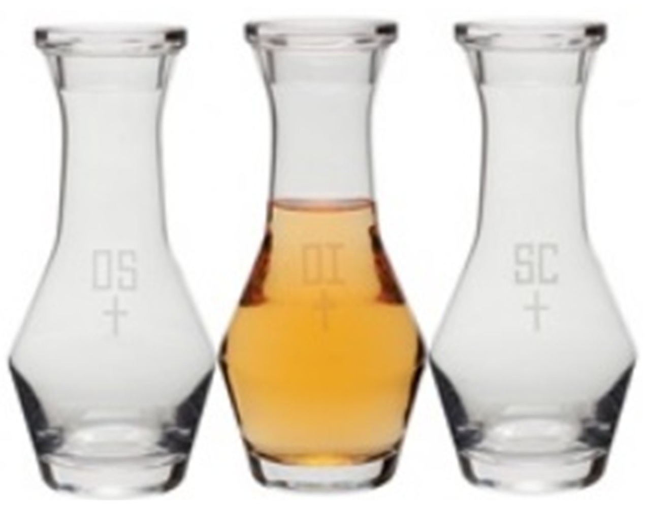 Ambry / Chrismal Set. Engraved with OI, OS, and SC, each bottle holds 46 oz. 11" tall.