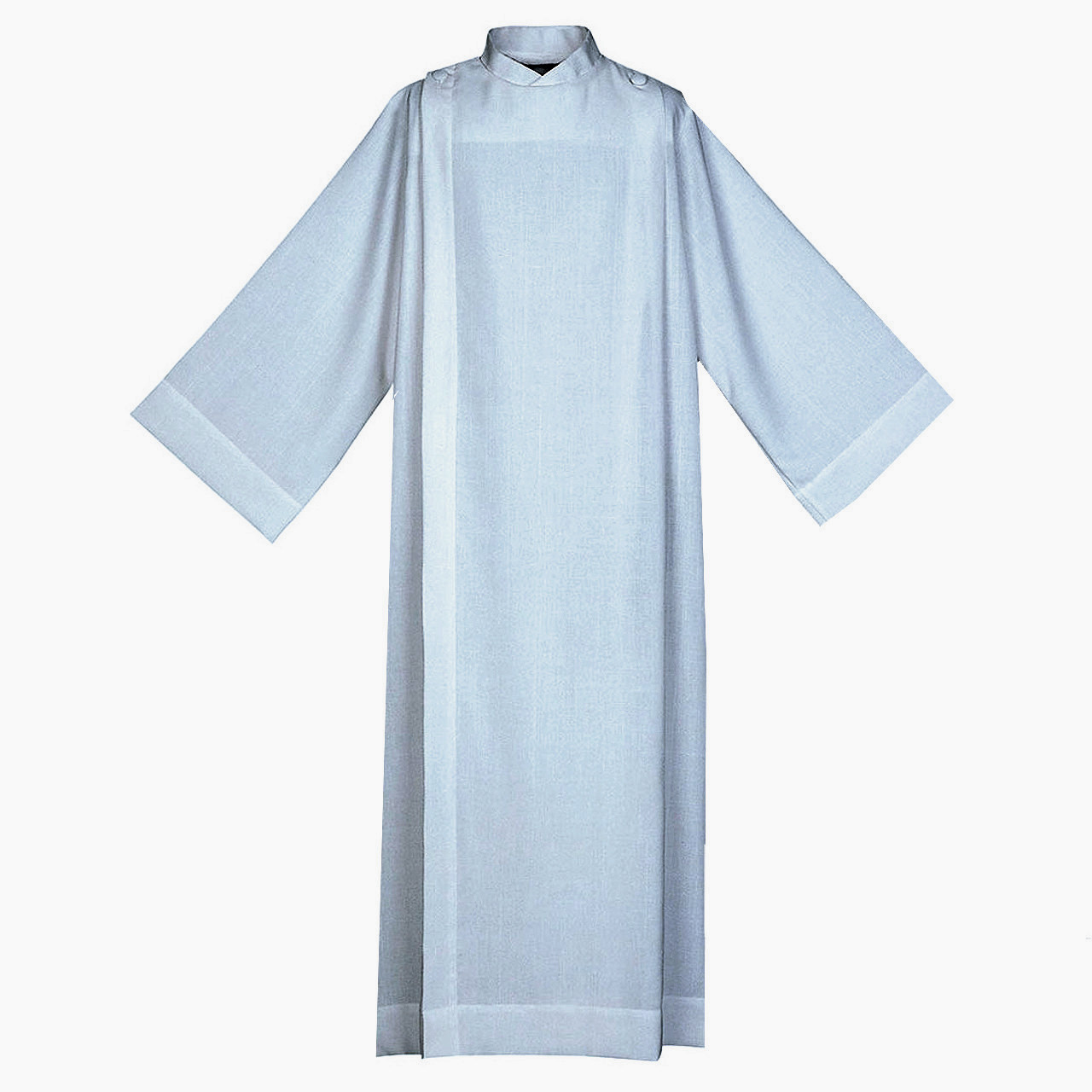 This Best Selling Front Wrap Alb is made in a Selection of Fabrics, with your choice of Fabric-Covered Buttons or a Velcro Closure. Please select from the following:
