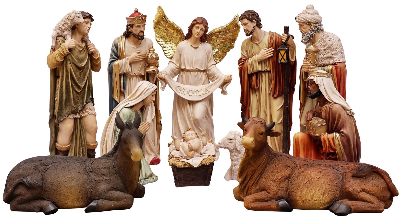 Please contact us for an accurate shipping rate by skid. This beautiful 39" Nativity Scene is made from weather-resistant resin for durability. Includes 11 pieces - Joseph, Virgin Mary, Baby Jesus in Creche, a Lamb, Ox, Donkey and 3 Wisemen. Handpainted with intricate details, these elegant figures are ideal for schools, churches, or sanctuaries. Its impressive craftsmanship makes it a meaningful addition to any spiritual setting. For indoor or outdoor use however may not be suitable for northern Canadian winters.