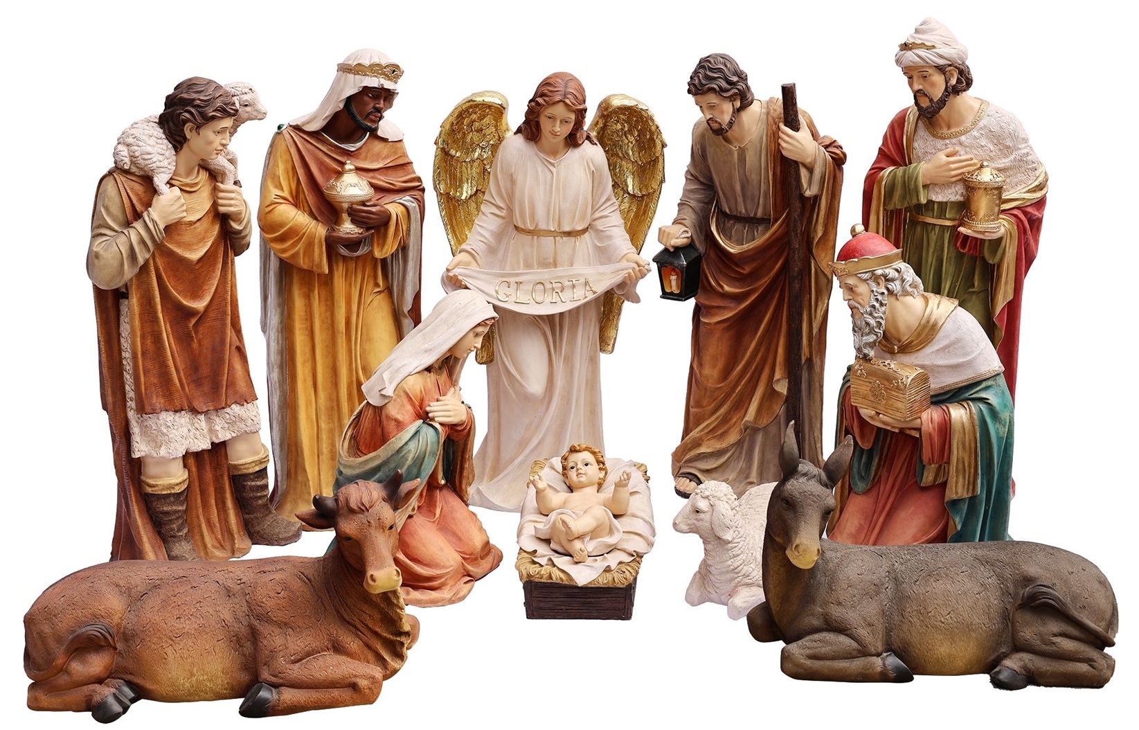 Please contact us for an accurate shipping rate by skid. This beautiful 47" Nativity Scene is made from weather-resistant resin for durability. Includes 11 pieces - Joseph, Virgin Mary, Baby Jesus in Creche, a Lamb, Ox, Donkey and 3 Wisemen. Handpainted with intricate details, these elegant figures are ideal for schools, churches, or sanctuaries. Its impressive craftsmanship makes it a meaningful addition to any spiritual setting. For indoor or outdoor use however may not be suitable for northern Canadian winters.