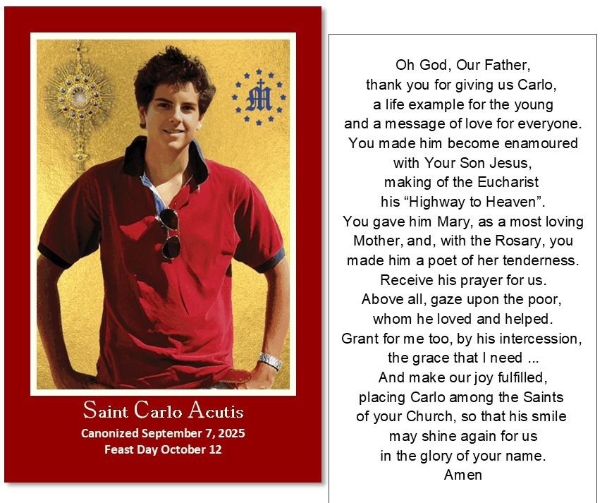 St. Carlo Acutis prayercard sold 50 per package. Carlo Acutis was an English-born Italian Catholic teenager known for his devotion to the Eucharist and his use of digital media to promote Catholic devotion. St. Carlo Acutis has been popularly called “the patron saint of the Internet” because of his interest in computers and because he built a website that documented miracles related to the Eucharist. He is the first millennial saint.