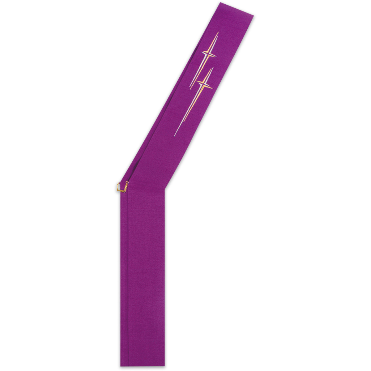 Deacon stole in washable Dupion, 70% man‑made fibres and 30% viscose. Style 34: embroidery in front on chest height, at the back on lower panel. Worn from left shoulder to right hip. Exquisite embroidery in colour threads. Only available in the designs as shown. All designs are available on each liturgical colour.