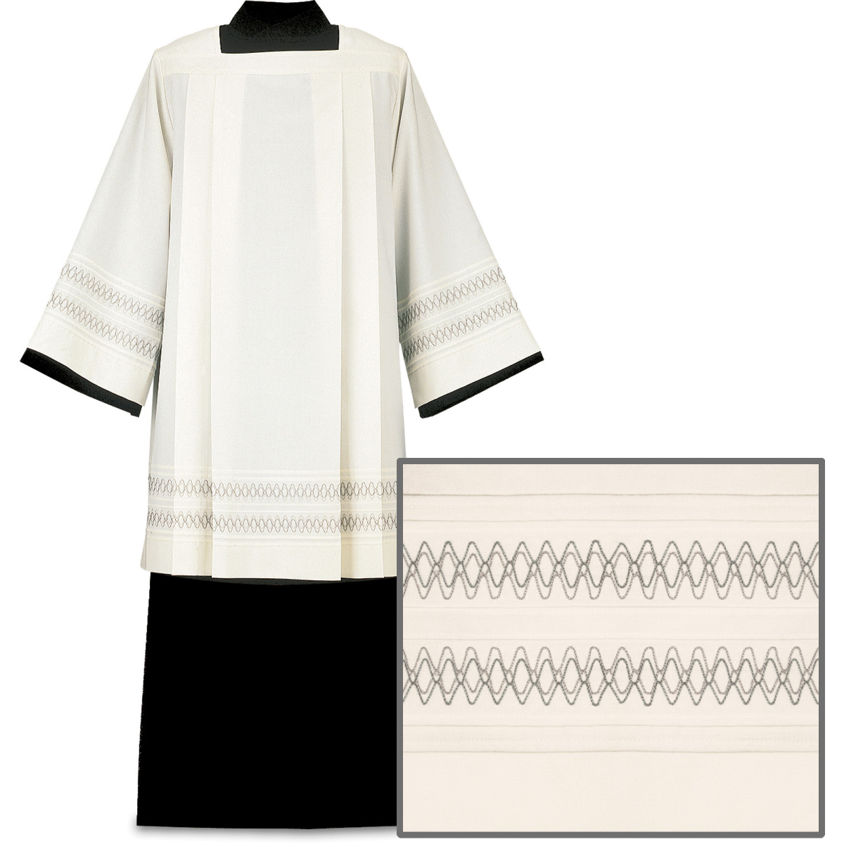 Washable surplice in Greco, beige. with a square neck finish and four pleats in front and back. The sleeves and skirt are decorated with stitched pleats and washable linear embroidery in grey(59).