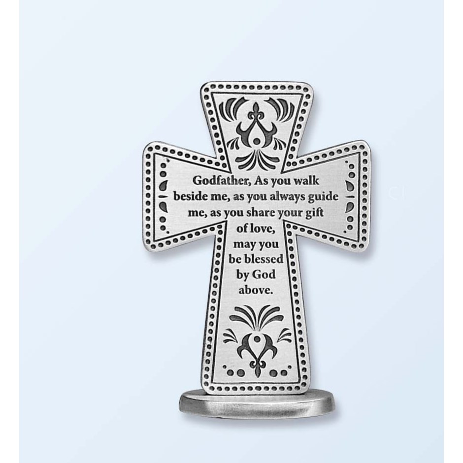 Gift the Godfather 'Thank You' Metal Standing Cross, a thoughtful present to honour his role. This beautiful cross is a lasting symbol of gratitude, faith, and the special bond shared. Reads: Godfather, God bless you for always being there, to help and guide with love and care." Made of pewter with a bright hand polished finish. Gift boxed. Stands 3" high.