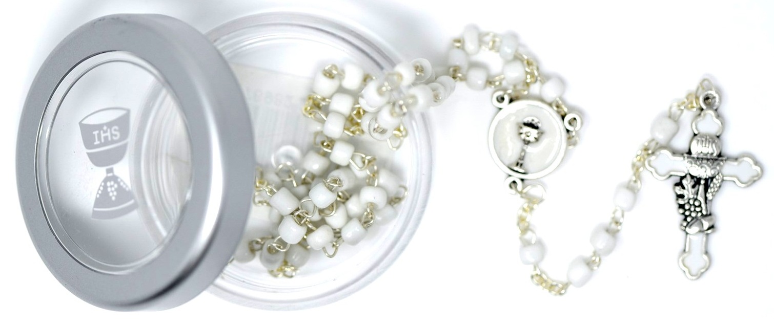A wonderful rosary for a First Communion celebrant. 5mm white glass bead rosary accented with white enameled Chalice cross and Chalice centrepiece. Packaged in a plastic Chalice rosary box. Made in Fatima, Portugal.